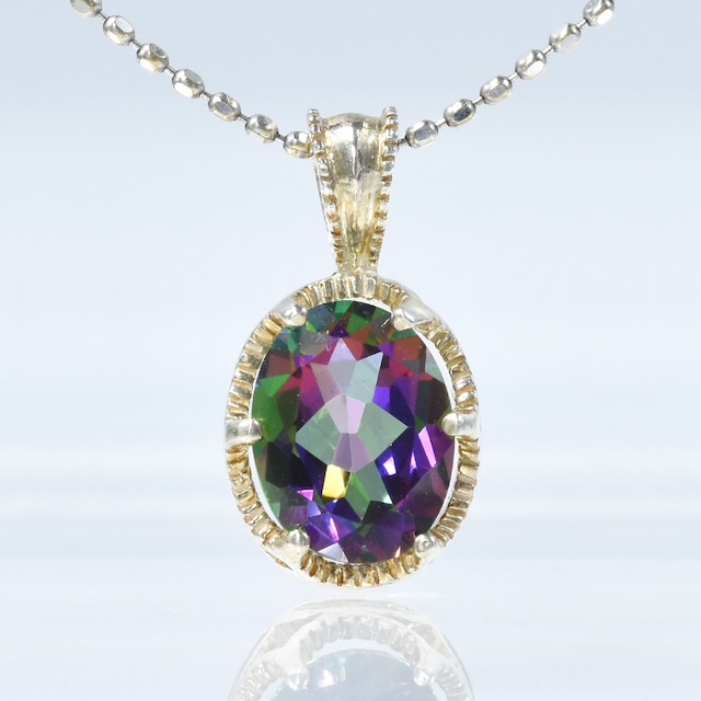 神秘的な虹色に輝くミスティックトパーズ。 11月の誕生石。 多彩に煌めく大粒な1石を【Primavera-プリマヴェーラ-】ペンダント トップに仕立てました。 ミステリアスな光りを透過するように台座部分にダイヤマークの窓をあしらった、当店のオリジナル枠です。 枠の素材は、SV925(スターリングシルバー)。 ミスティックトパーズのカラフルな煌めきが、胸元で美しく輝きます。 【商品情報】 ■石名:ミスティックトパーズ(約6×8mm) ■トップサイズ(横・縦・厚み):約7.8×14.2×4.9mm ■素材:SV925(スターリングシルバー) ■SVの刻印入り ■作品No.CK017CIBSN-YP-026 【備考】 *写真のお品を即納です。 *ペンダントトップのみの販売です(チェーンは別売りです)。 *画像のチェーンはサンプルです。カットアズキチェーンではありません。 *手作りの為、サイズは前後する場合がございます。 *カラーストーンのインクルージョン(内包物)、微細な傷、カット、大きさ、輝き、色あいの違い等は天然石の証です。また、画面で見る色合いと多少異なる場合がございます。 *こちらの商品は当店の他ショップと共有しているため、ご注文時、購入確定ではございません。ご注文後、当店からメールにて在庫状況を改めてお知らせいたします。