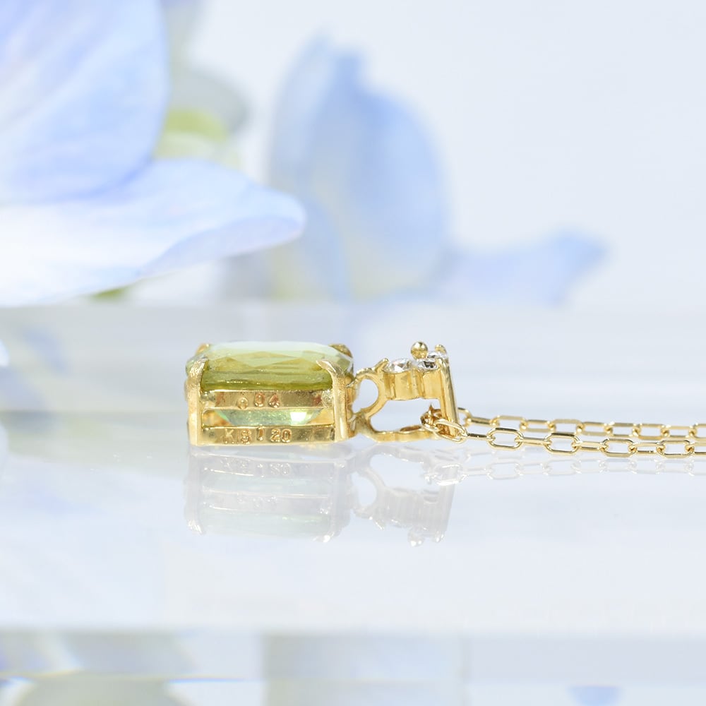クリアなイエローグリーンカラーの大粒は、きらきらと石の中からファイアが溢れます。
