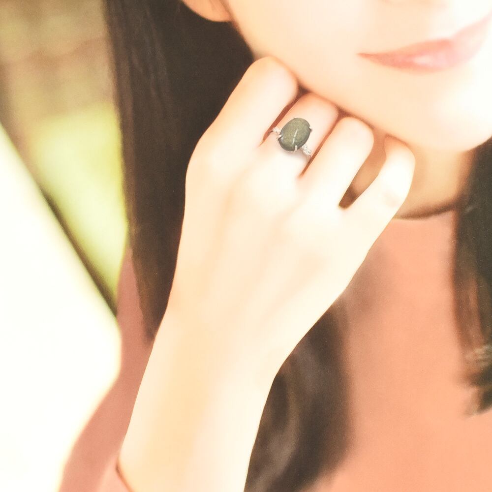 そっと寄り添うようなジルコニアの煌めきが、主石の大粒カボションの魅力を引き立てています。
