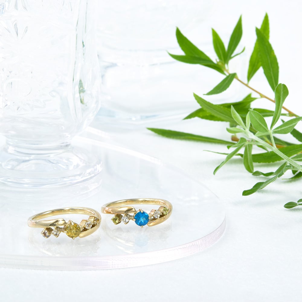 両サイドにペリドットとホワイトトパーズを添えて、キラキラとカラフルに。
