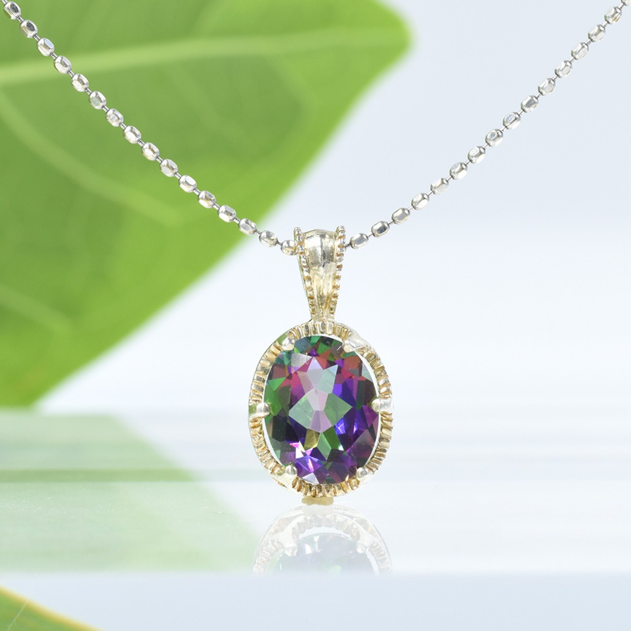 ミスティックトパーズのカラフルな煌めきが、胸元で美しく輝きます。