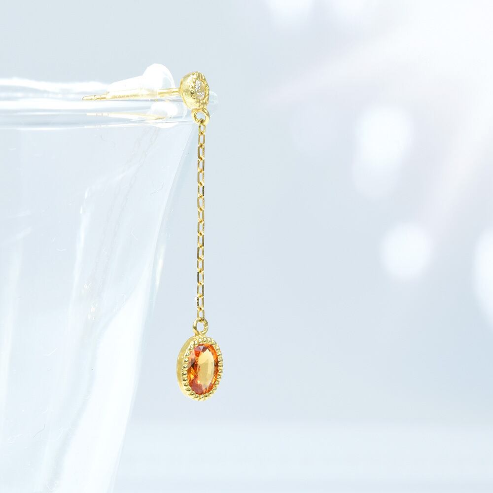 オレンジサファイア×ダイヤと、ミルグレイン枠のイエローゴールド。