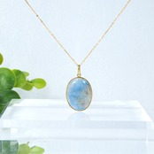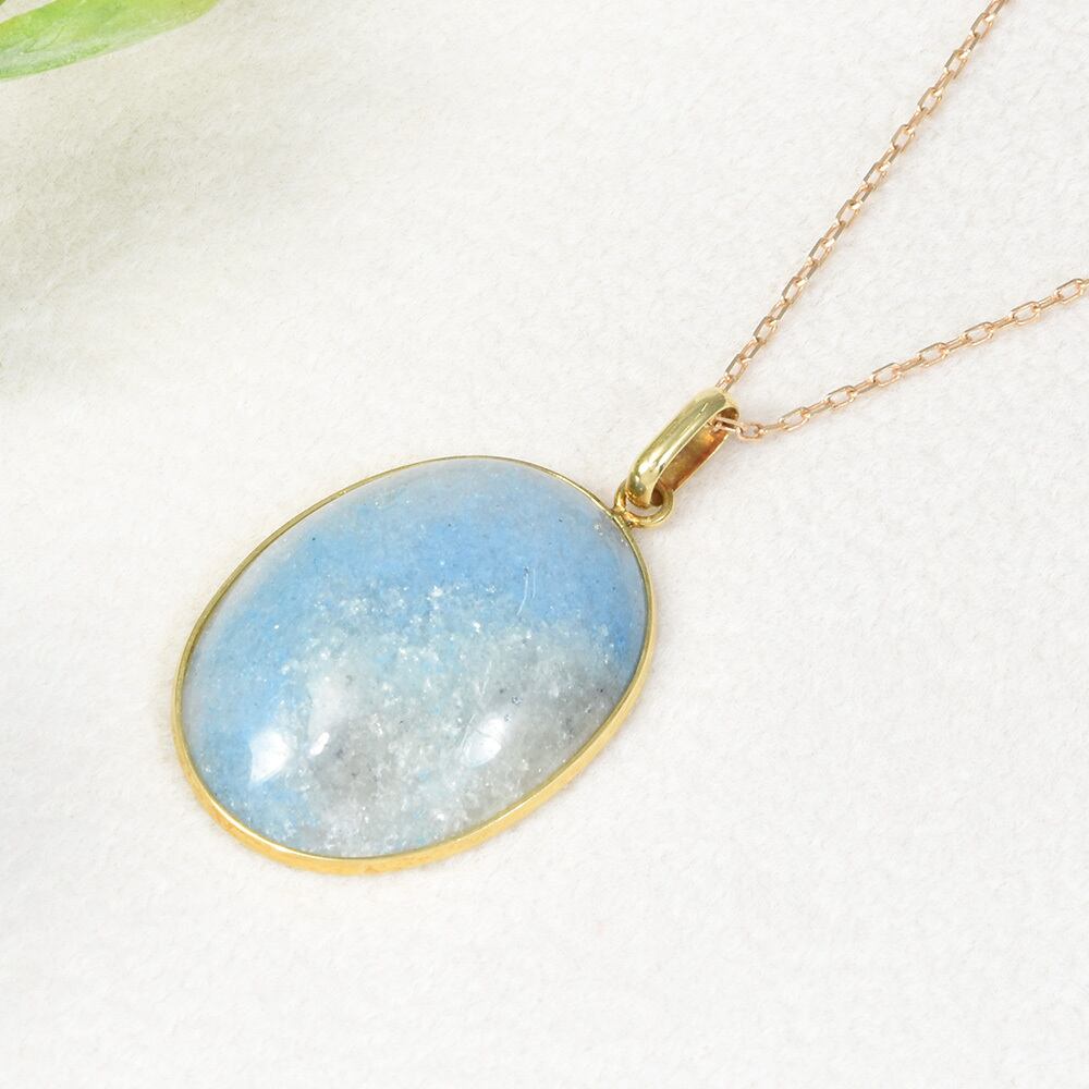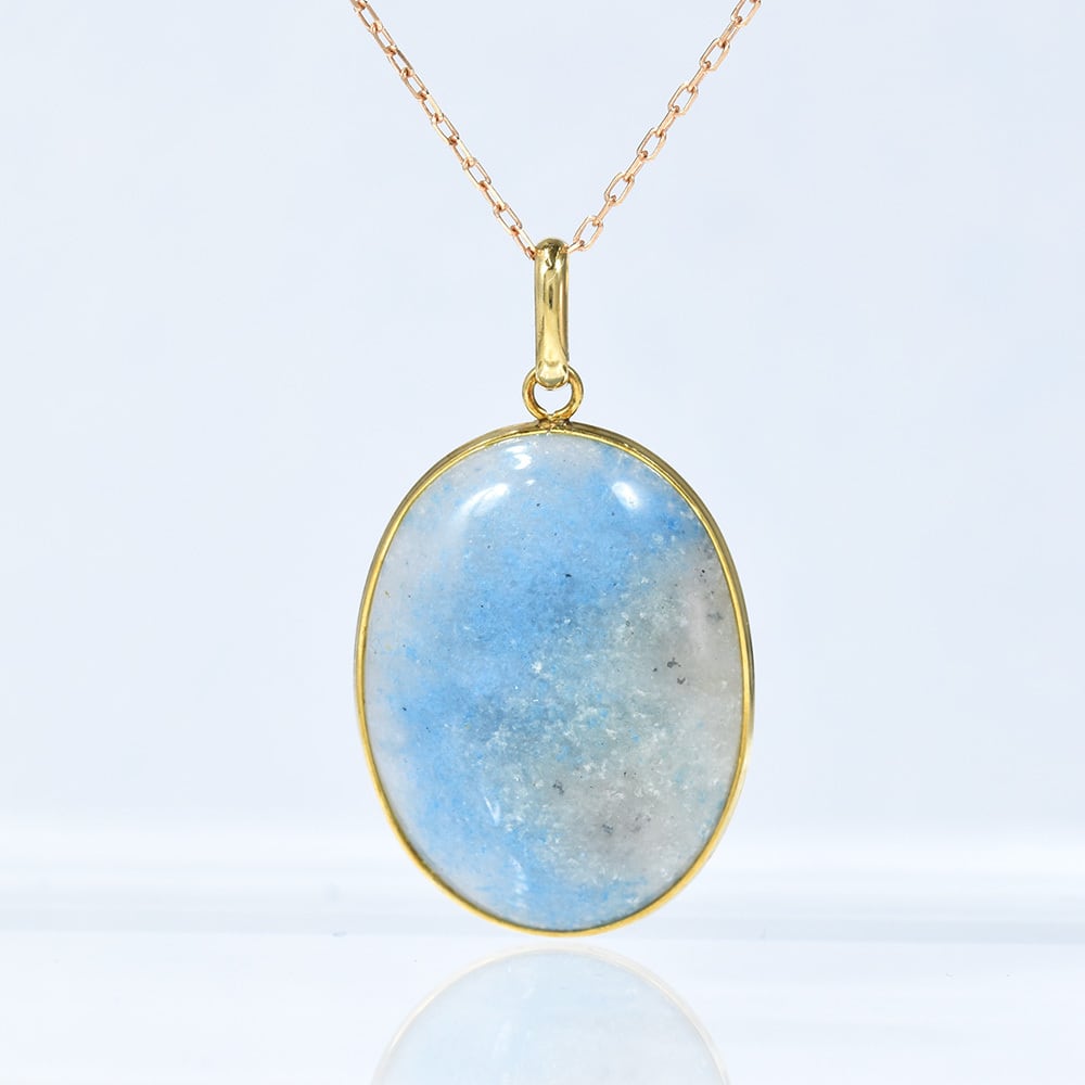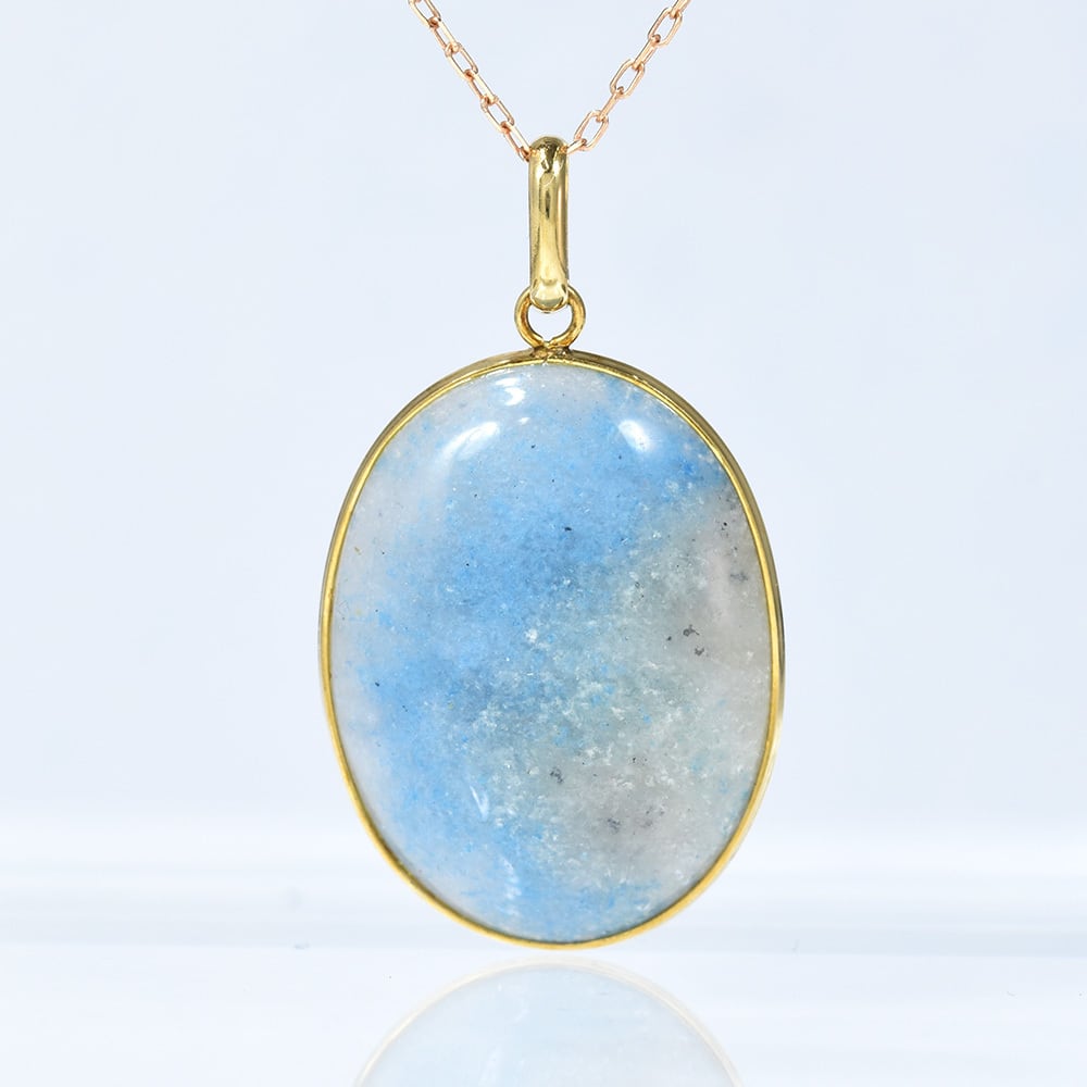 光によって表情を変えるブルークォーツが、デコルテに美しい彩りを添えてくれます。