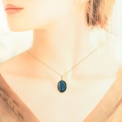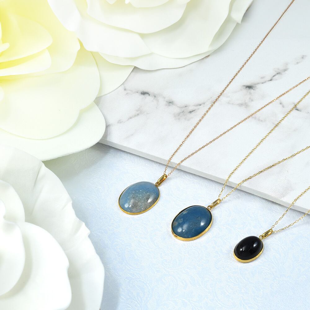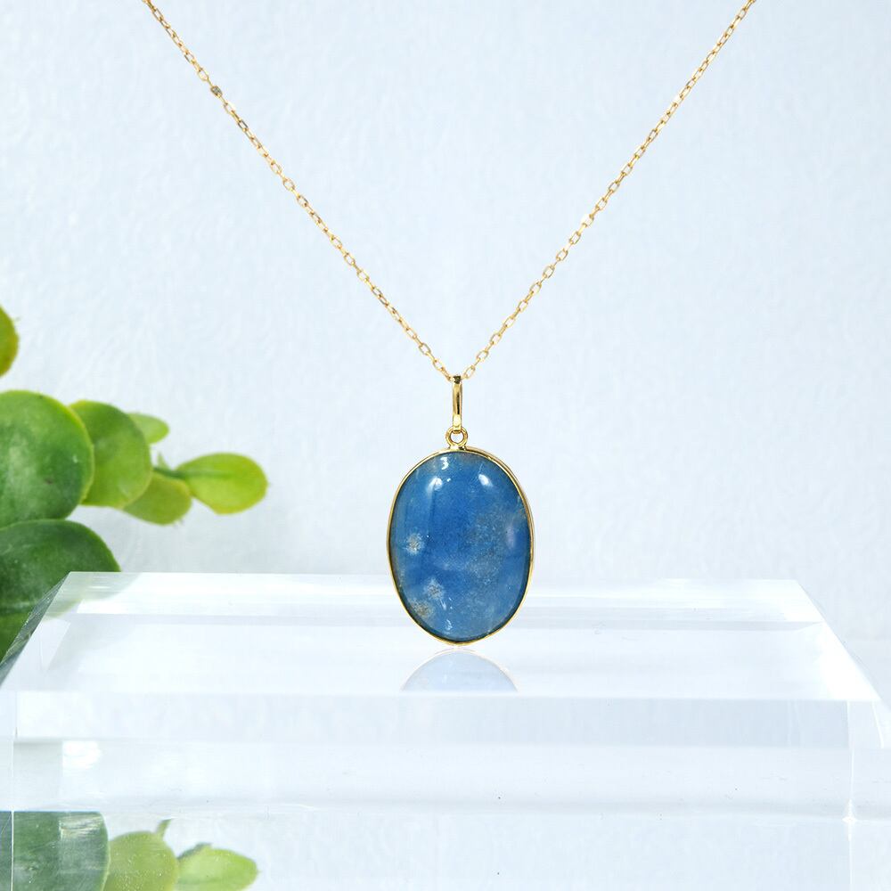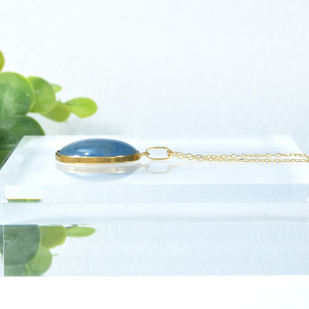 光によって表情を変えるブルークォーツが、デコルテに美しい彩りを添えてくれます。